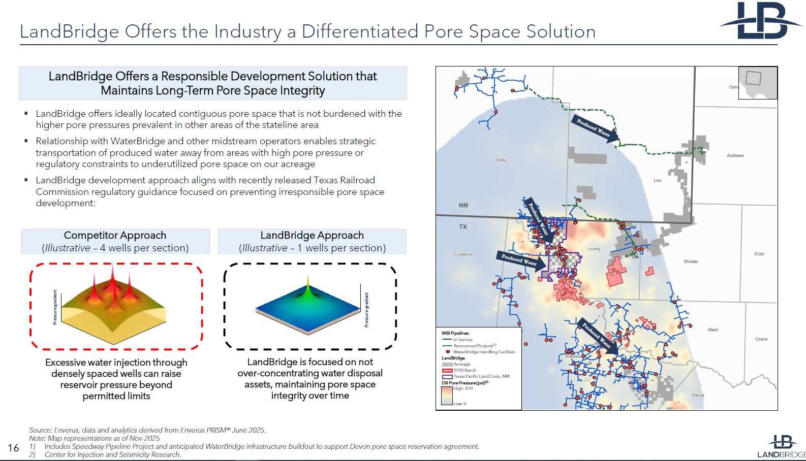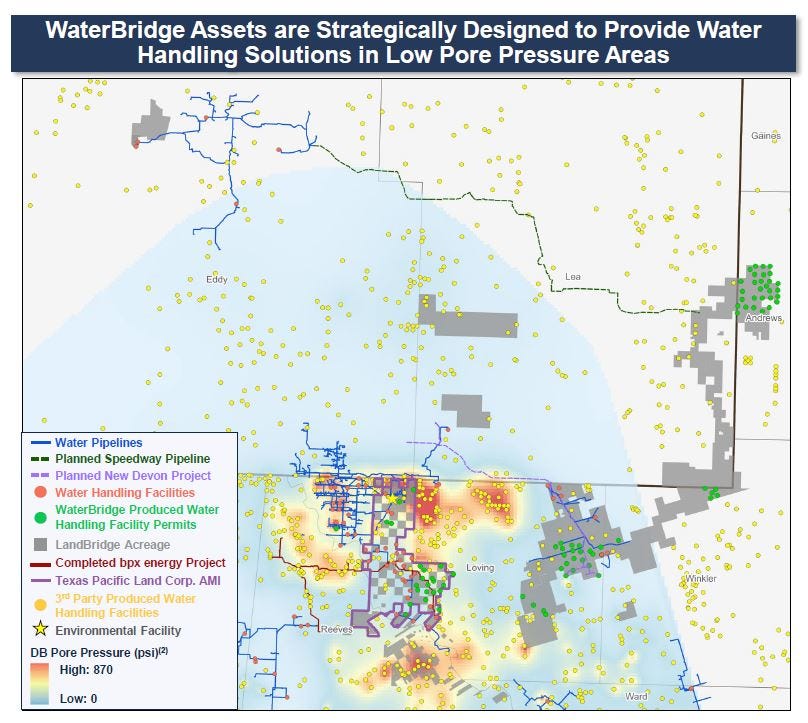 When the practice of using shallow SWD wells took off, north central Loving County attracted many of the first SWD wells given its proximity to the New Mexico border and being controlled by a limited number of landowners who controlled a vast swath of land. Consequently, the area quickly became over pressurized, as you can see reddish area on the above map (an up-close of version can be seen below (6)). Currently,1.5mmbpd of produced water is disposed of in LandBridge’s pore space. LandBridge owns an incremental 6.9mmbpd of incremental pore space. WaterBridge transports the produced water and operates the disposal wells, which are on LandBridge’s property. LandBridge gets paid royalties to allow WaterBridge to access its pore space. It would be akin to owning, but not operating, a landfill and getting paid a royalty based on the volume of trash disposed of into the landfill.