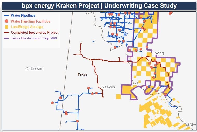 Culberson County: The final circle shows Coterra’s massive position in Culberson County. This is the area where Coterra had shut-ins due to issues with both deep and shallow injection wells. Looking at the picture immediately above, it shows that it does not appear to be too hard for WaterBridge to service this area and take water out of Culberson County. WaterBridge already has some pipelines that connect Culberson County to the BPX Kraken Project.